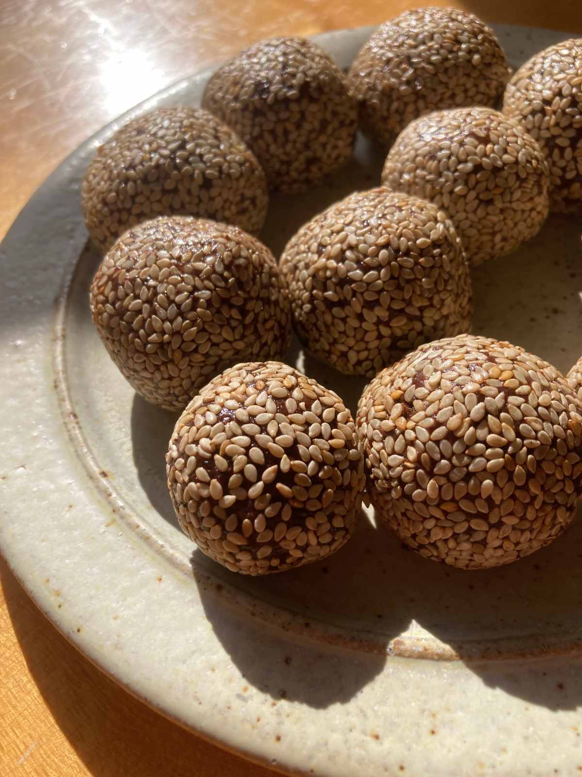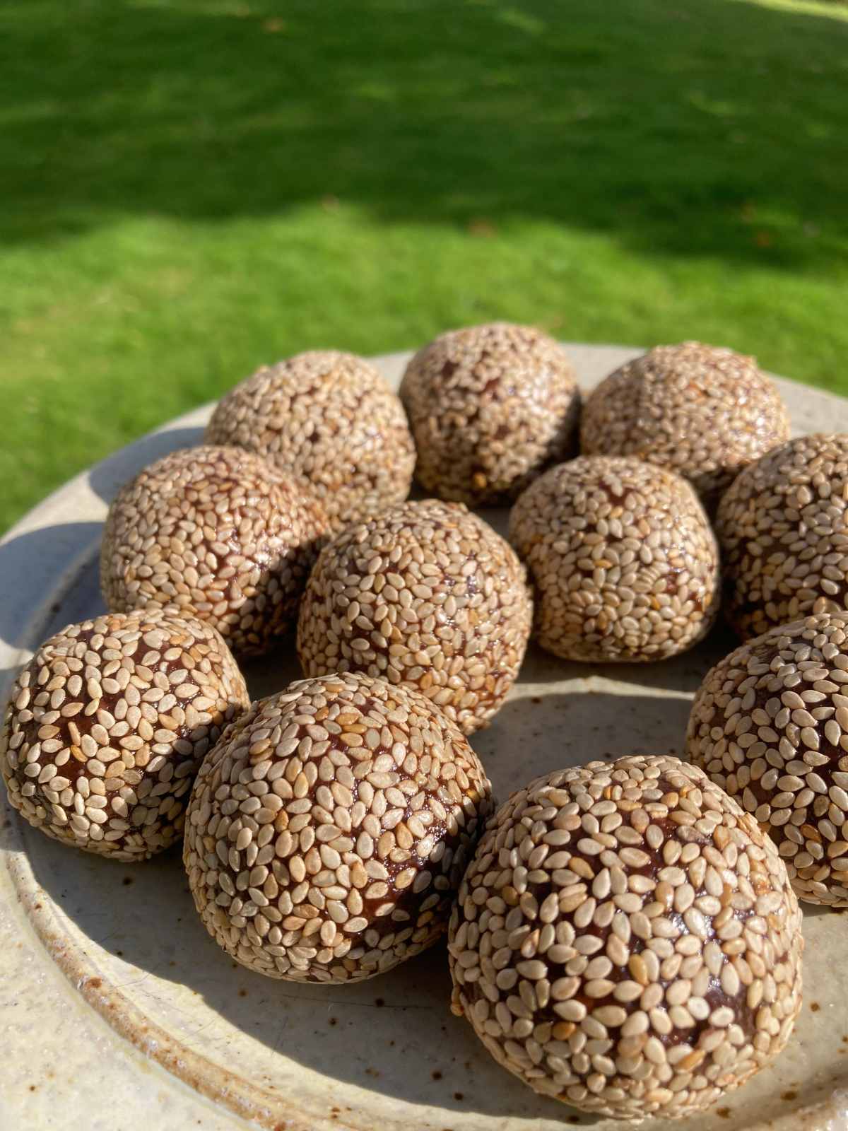 - Shape into balls and roll in the sesame seeds.